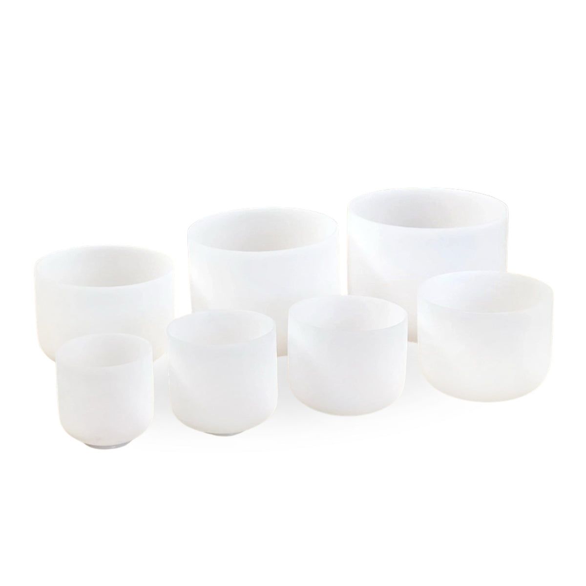 Our Crystal Bowl Sets are available in : Frosted White They come in two sizes—6-12 inches —and is crafted from high-quality quartz crystal to produce exceptional sound and vibrational healing. Each bowl is carefully tuned from A to G, offering a series of harmonious and resonant tones that support relaxation and healing.